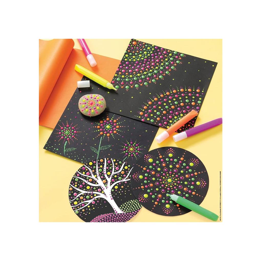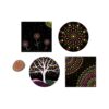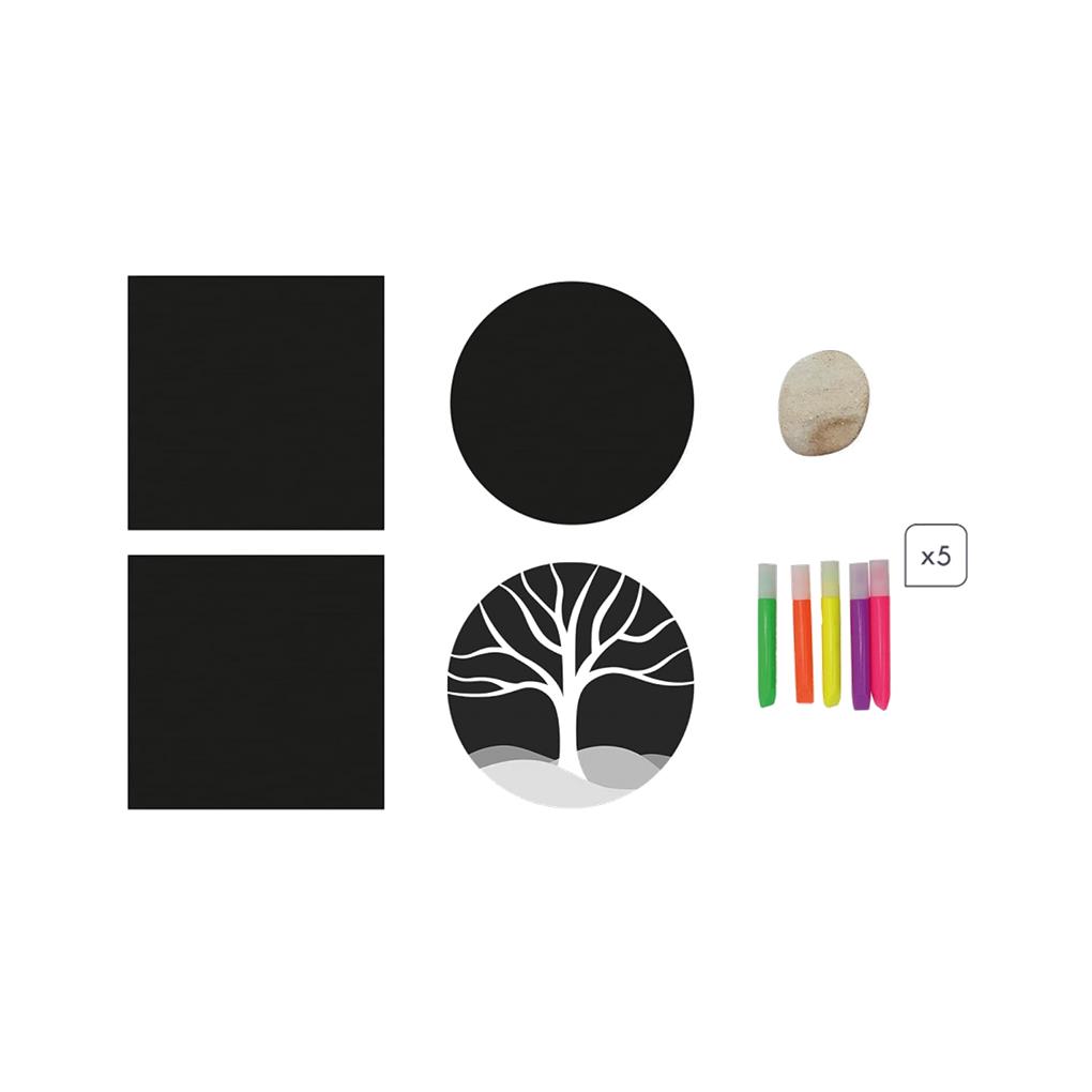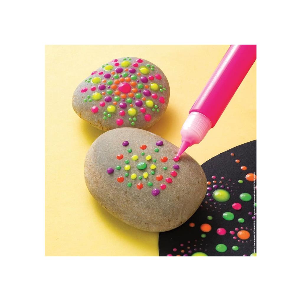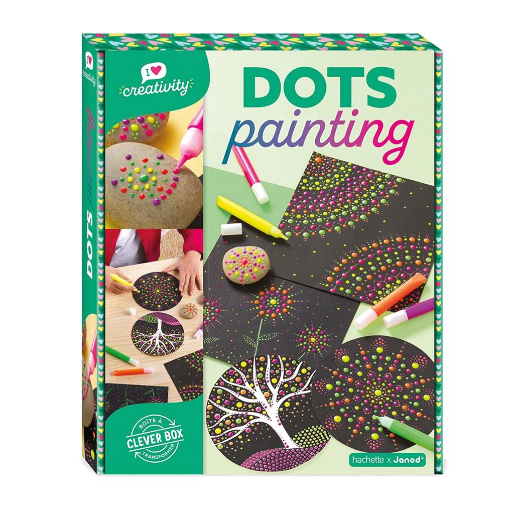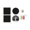 Kit creativo para pintar cuadros con la técnica de la pintura con puntos , este estuche creativo permite decorar 4 cuadros negros y un canto rodado con puntos de pintura en relieve de diferentes tamaños
