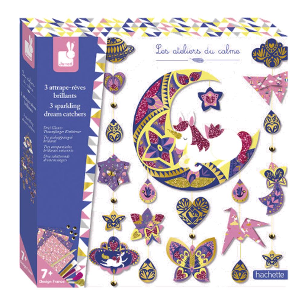 Contenido: 3 atrapasueños para montar con la ayuda de 3 tarjetas precortadas: 1 tarjeta para rascar, 1 tarjeta para decorar con 2 tubos de purpurina y 1 tarjeta con detalles dorados, 4 metros de hilo dorado y 4 metros de hilo de color rosa, 10 perlas doradas, 4 hojas de origami, 1 utensilio de madera