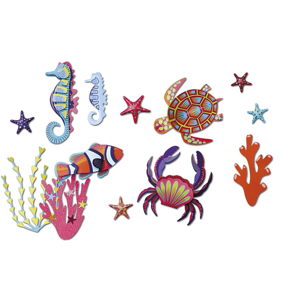 ¡Nos embarcamos en un viaje bajo el océano gracias a este kit creativo para niños de Ateliers du Calme que permite crear 4 animales marinos con papel! Los elementos de papel precortados se superponen siguiendo la guía paso a paso proporcionada y utilizando los cuadrados adhesivos de espuma de doble cara. Veremos aparecer tortugas, cangrejos y otros peces, ¡es mágico! Las estrellas de mar y los corales en 3D también ayudan a completar la escena. Luego usamos las pegatinas para completar la decoración y estos hermosos trofeos están listos para exhibirse en la habitación y crear una atmósfera tropical. Tomará aproximadamente 1 hora hacer todos los elementos de papel.