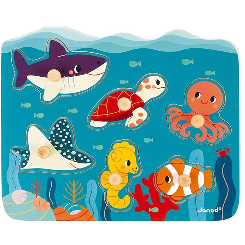 ¡Este puzle para niños pequeños reúne a los animales más impresionantes y bonitos del fondo marino para divertir a los más pequeños y despertar su curiosidad! Este puzle de madera para bebés a partir de 18 meses permitirá al niño sumergirse en el universo del mundo marino mientras ejercita la lógica y la motricidad fina. Hay que colocar las seis piezas de animales en su sitio del tablero. El bebé puede moverlos fácilmente gracias a los agarradores de madera adaptados para las manitas de los más pequeños. Madera con certificado FSC® (madera procedente de bosques gestionados de forma sostenible). Pintura al agua. ¿Lo sabías? Los océanos y mares cubren el 70 % de nuestro planeta: ¡representan el 97 % del agua de toda la Tierra! Proporcionan alimentos y oxígeno y regulan nuestro clima. Juguete desarrollado en colaboración con WWF®. Janod apoya los esfuerzos de WWF® para preservar el medio ambiente y la biodiversidad con una nueva gama de juguetes hechos con materiales más sostenibles. Con esta gama, nuestro objetivo es inspirar y concienciar a las nuevas generaciones para que trabajen en la defensa de la fauna y la naturaleza.