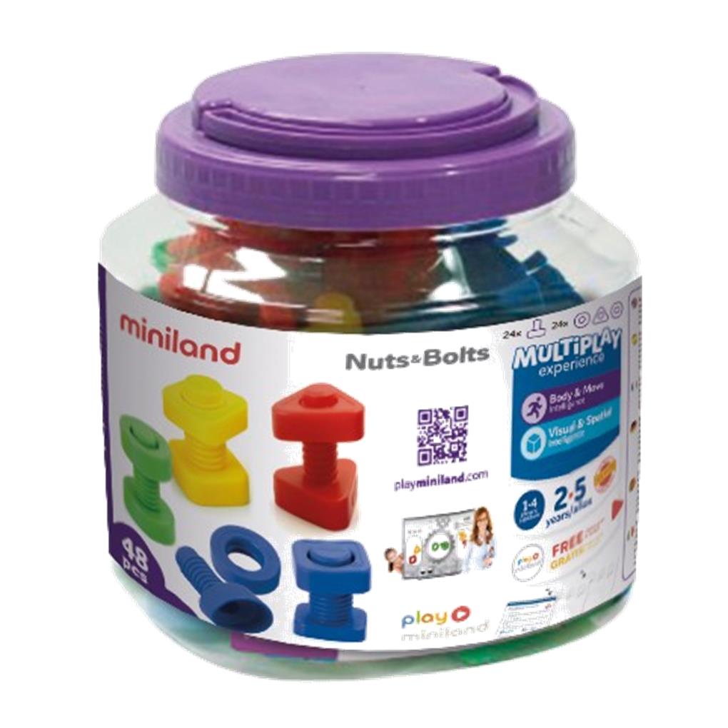 Tornillos y tuercas de gran tamaño, con las 3 formas geométricas básicas: círculo, cuadrado y triángulo. Potencian la destreza manual y la coordinación visomotora al enroscar y desenroscar. Plástico muy resistente.