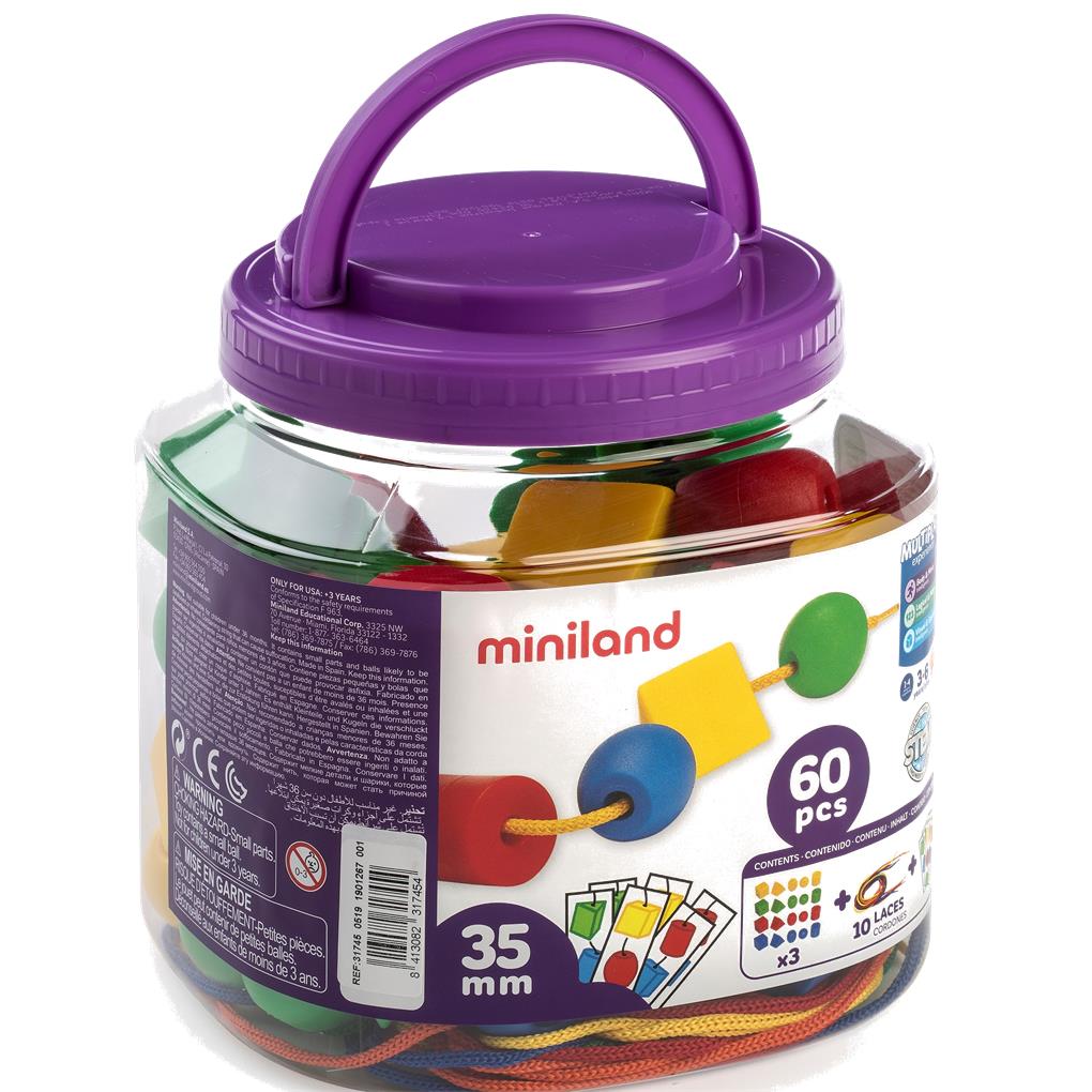 Juego de ensartar para favorecer la ejercitación y coordinación óculo-motriz. Contiene 5 formas diferentes, cordones trenzados de 1 metro y una recopilación de actividades de variados ejercicios en forma de tarjetas individuales.