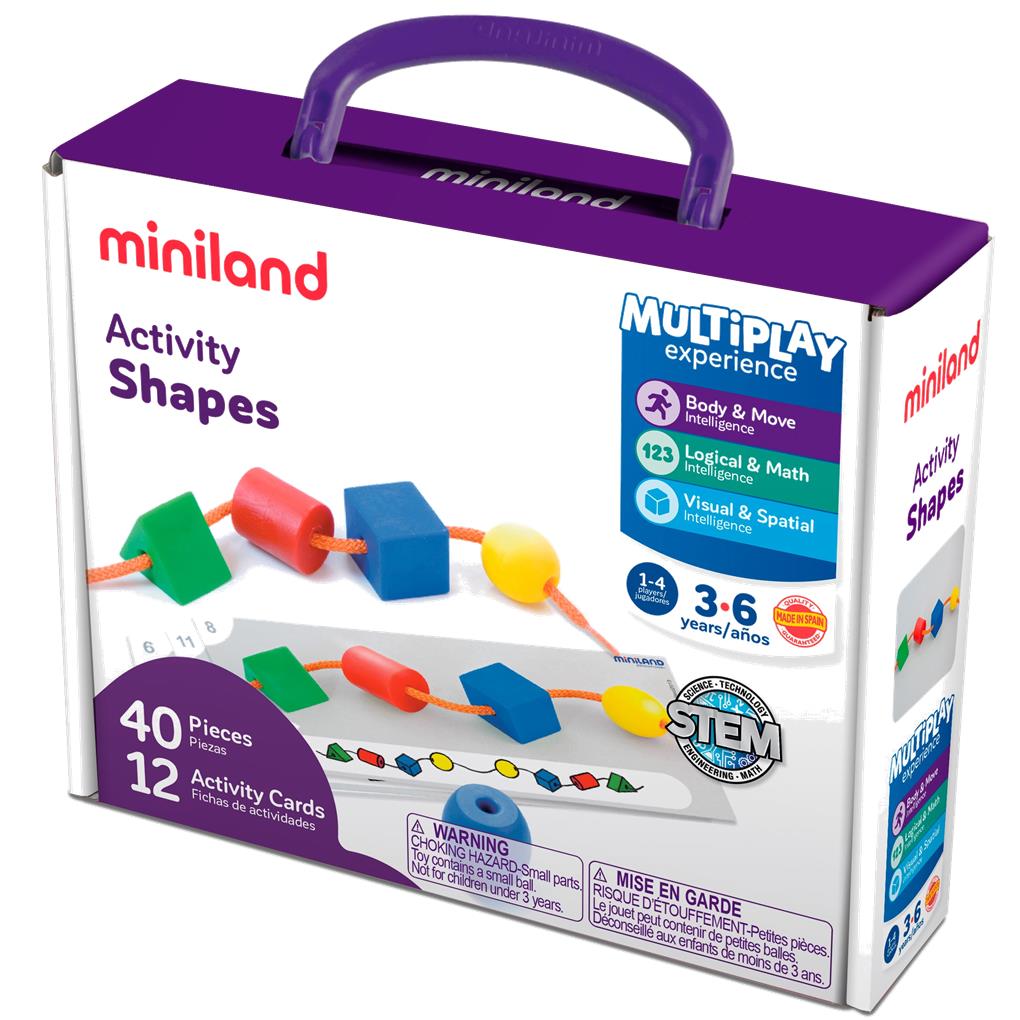 Juego de ensartar para favorecer la ejercitación y coordinación óculo-motriz. Contiene formas diferentes, cordones trenzados de 1 metro y una recopilación de actividades de variados ejercicios en forma de tarjetas individuales.