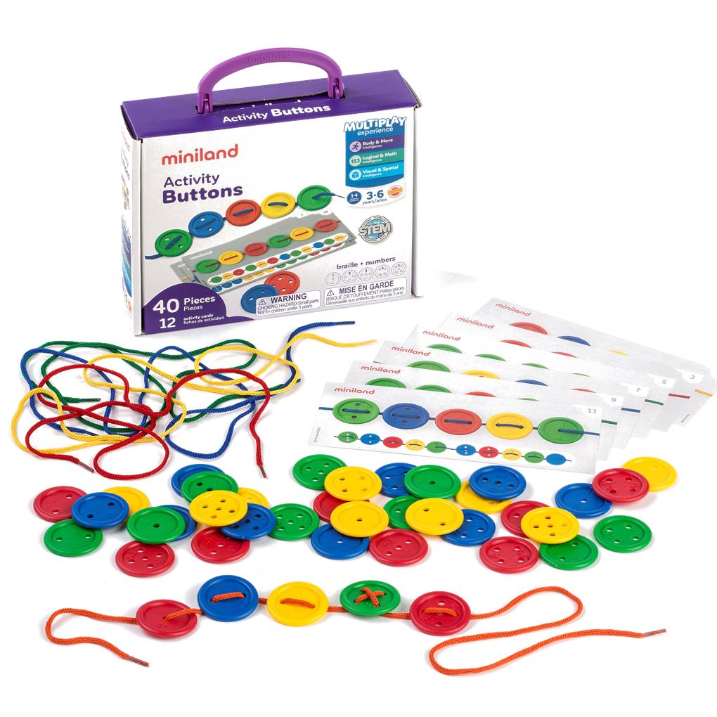 Juego de ensartar, con grandes botones de 1 a 5 agujeros y en vivos colores. Para seriación y clasificación. Estimulan la motricidad fina del niño. Incluyen en relieve la grafía del número y también su representación en braille. El conjunto se completa con fichas de actividades individuales y 10 cordones de 1 metro.