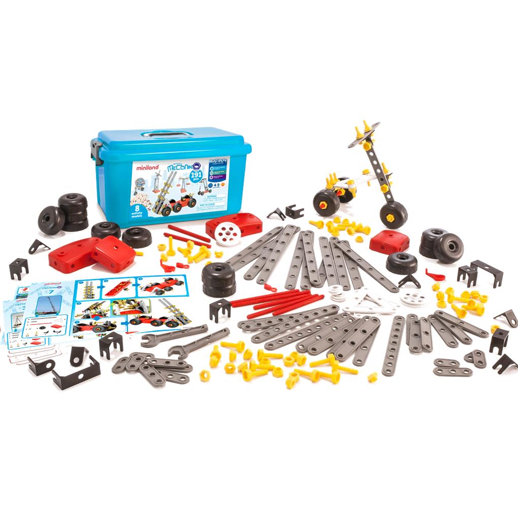 Completamente renovado, el juego de “primeras ingenierías” con nuevos elementos y nuevo diseño. Provisto de variedad de elementos de montaje, incluyendo además llave inglesa, tornillos, tuercas, poleas, etc. Las fichas-modelo que incluye el set son de gran tamaño y se detallan en pasos progresivos, favoreciendo la atención y el razonamiento. Estos razonamientos sientan la base para empezar a realizar montajes más complejos desarrollando la creatividad.