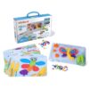 Figuras para coser de plástico flexible que representan objetos comunes. Estimularán la psicomotricidad y la coordinación “ojo-mano” de los peques.