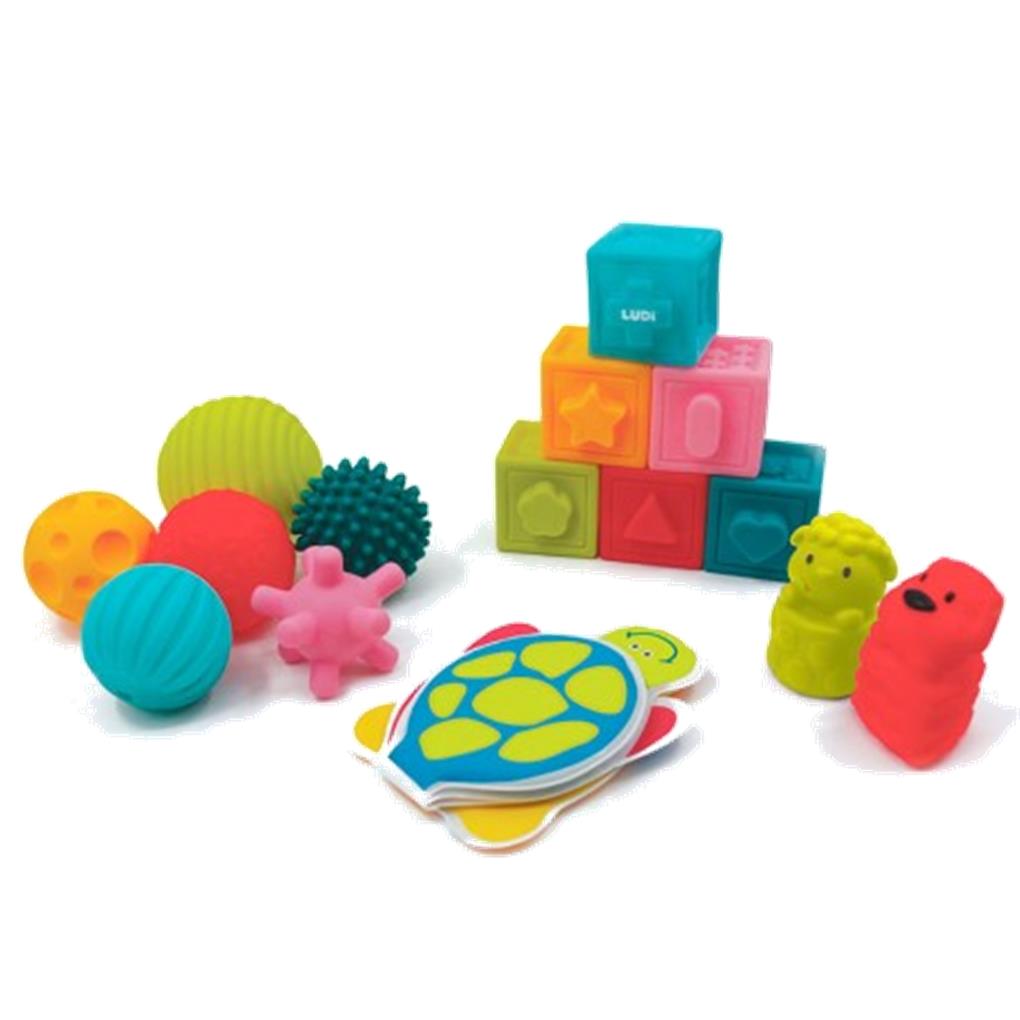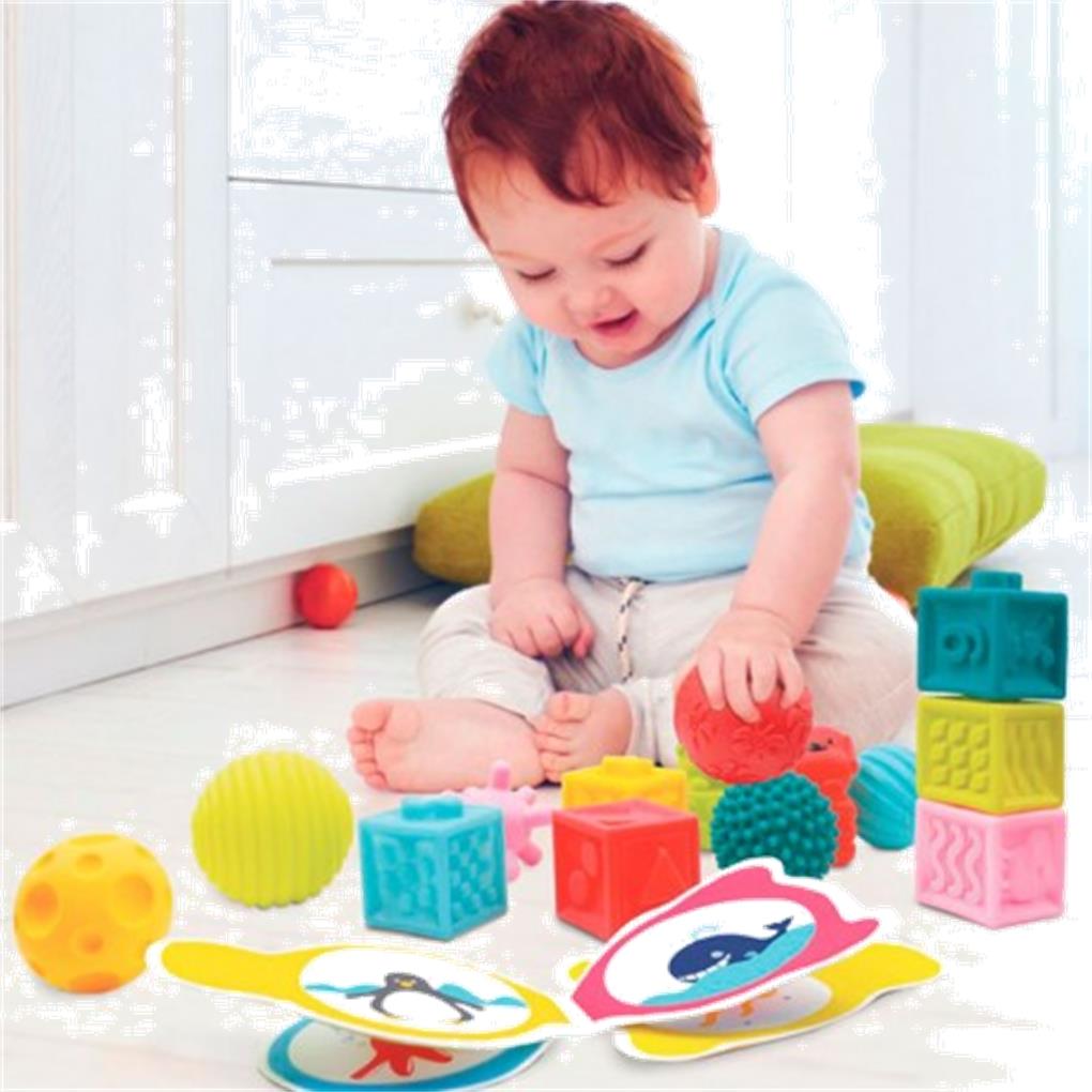 Un juego de 6 pequeñas bolas sensoriales en colores muy brillantes intrigará al bebé. Acanaladas, lisas o puntiagudas, todas las bolas estimulan el sentido del tacto, la destreza y la coordinación de movimientos del bebé.