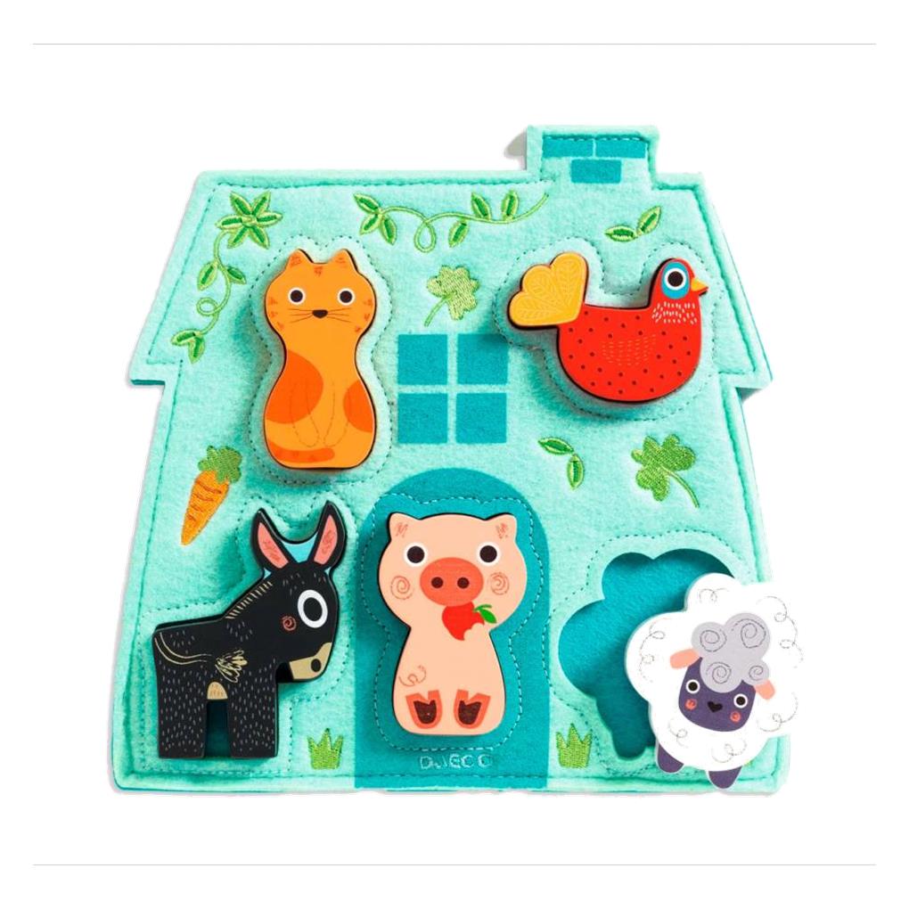 -Mouki es un puzle sobre el tema de la granja. Una bonita base en forma de granja de fieltro bordado y estampado y 5 animales de madera que pueden moverse.
