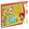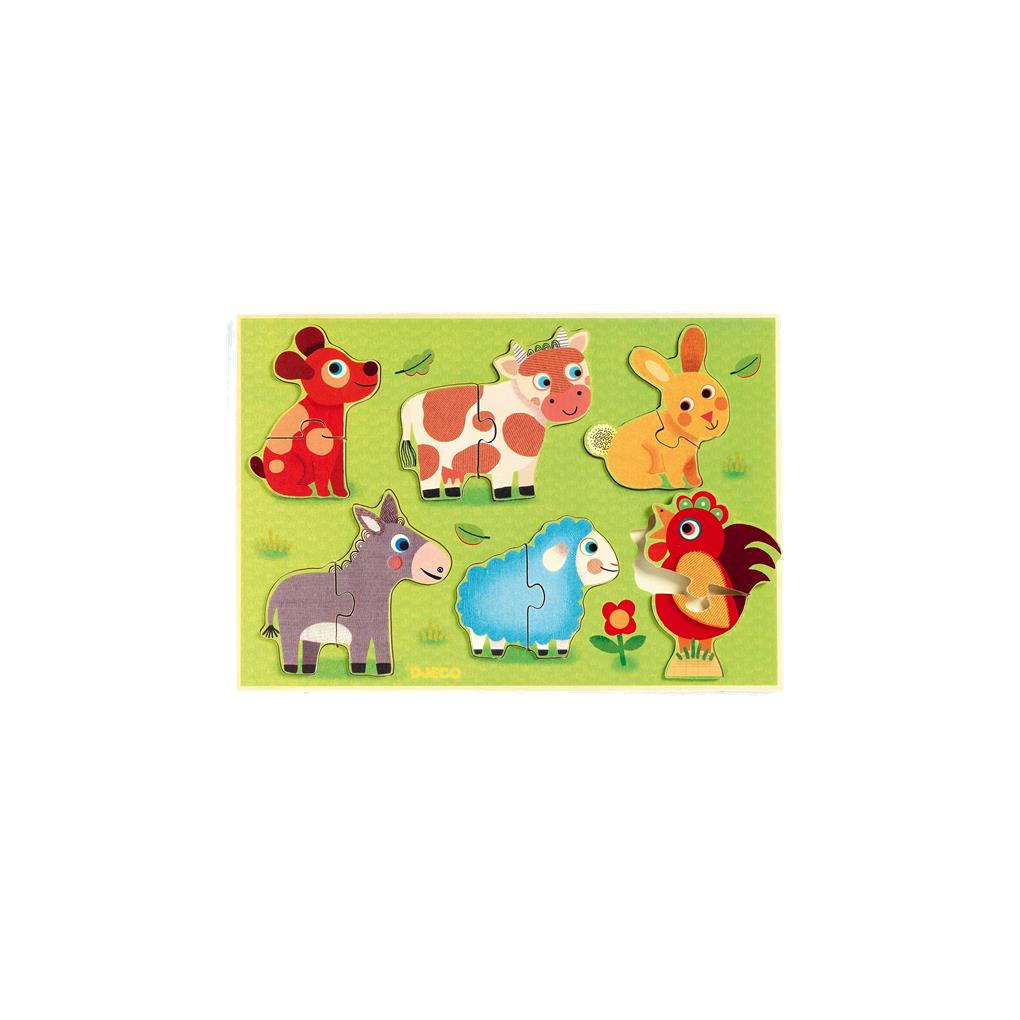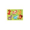 Una interesante forma de introducir el juego del puzzle ya desde bebés son los encajes. Este además, incorpora 2 piezas para cada uno de los animales que tenemos que encajar. El perro, la vaca, la oveja… cada cual en su lugar.