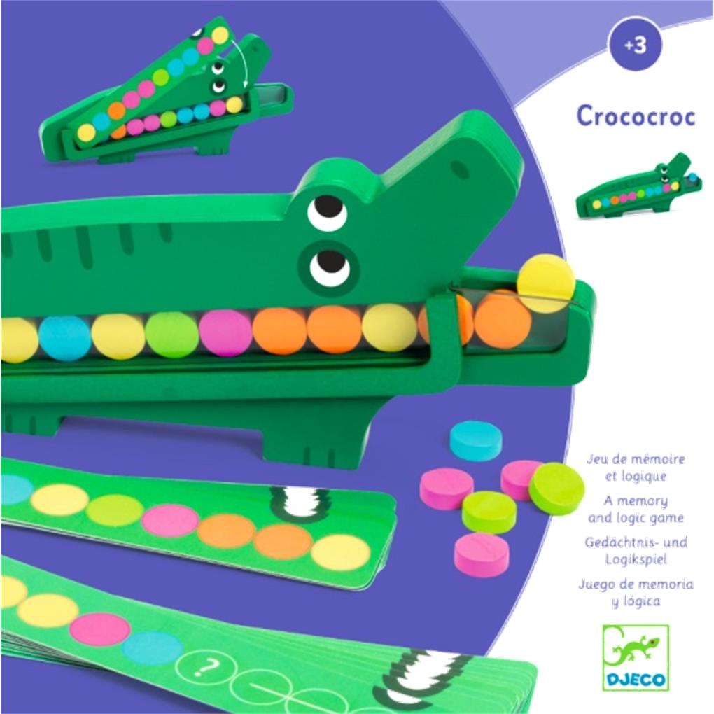 El juego educativo Crococroc consta de un cocodrilo de madera que devorará las fichas de colores. El/la niño/a ubica la tarjeta ocultando la barriga del cocodrilo. Luego, coloca las fichas de color siguiendo las instrucciones de la tarjeta sin mirar. ¡Para aprender jugando!