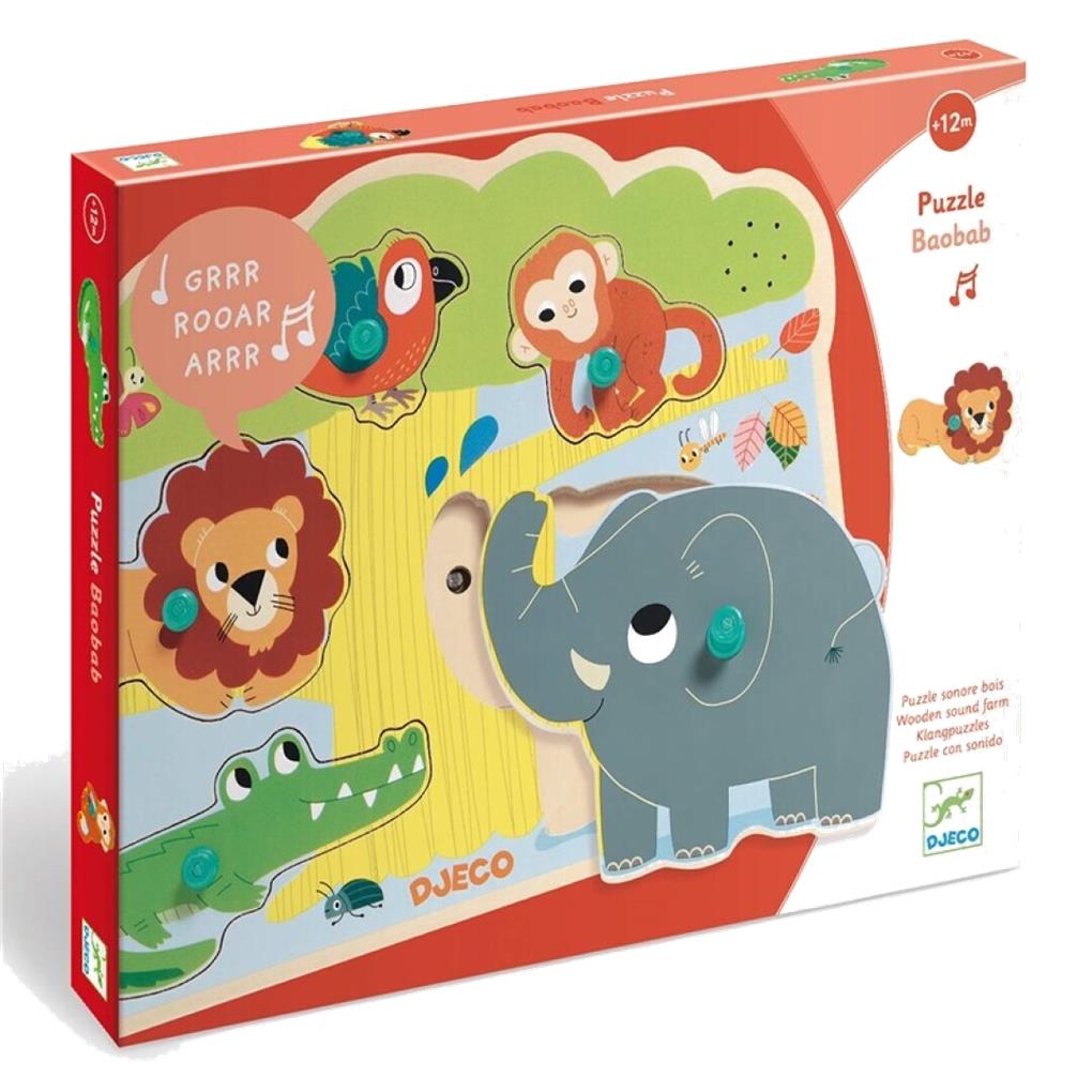 Baobab es un puzle de madera encajable y con sonido sobre el tema de la sabana.