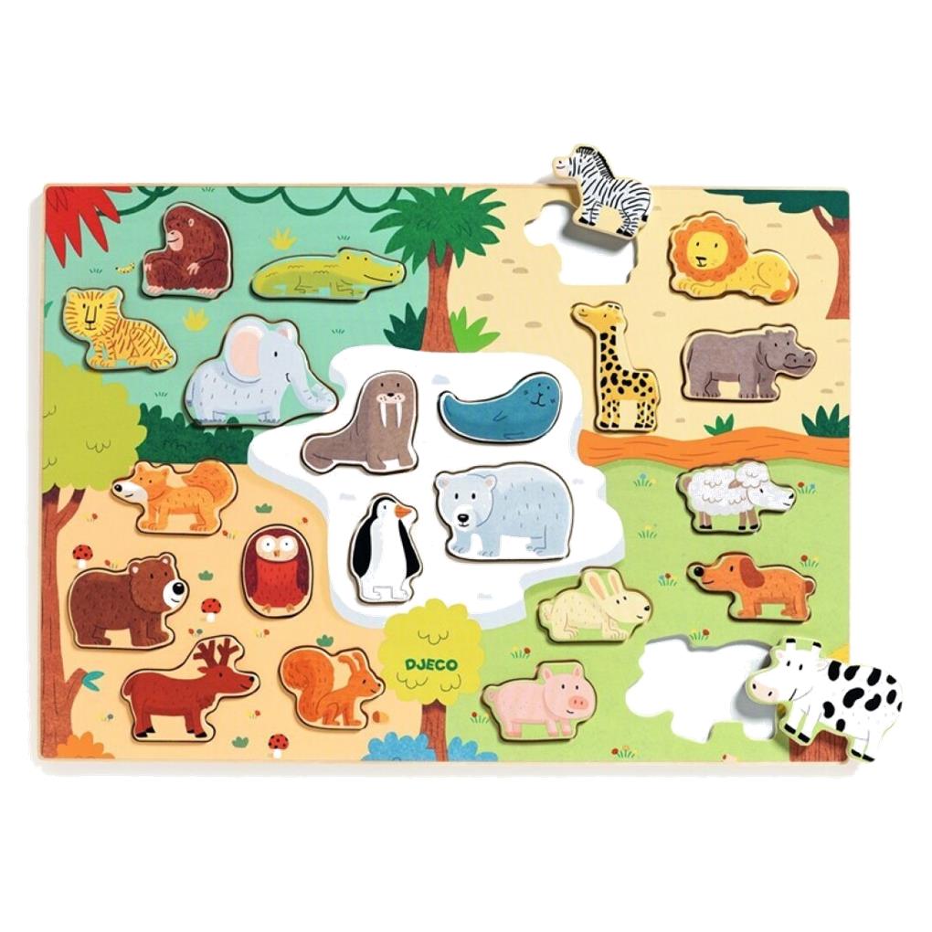 -Encajable Puzzlo Animo Djeco Djeco es un puzle de madera sobre el tema animales en la granja