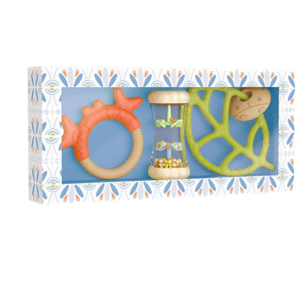 Baby blanco BabySet es una preciosa caja de nacimiento que incluye un pequeño sonajero tipo palo de lluvia y dos mordedores de madera y silicona.