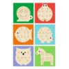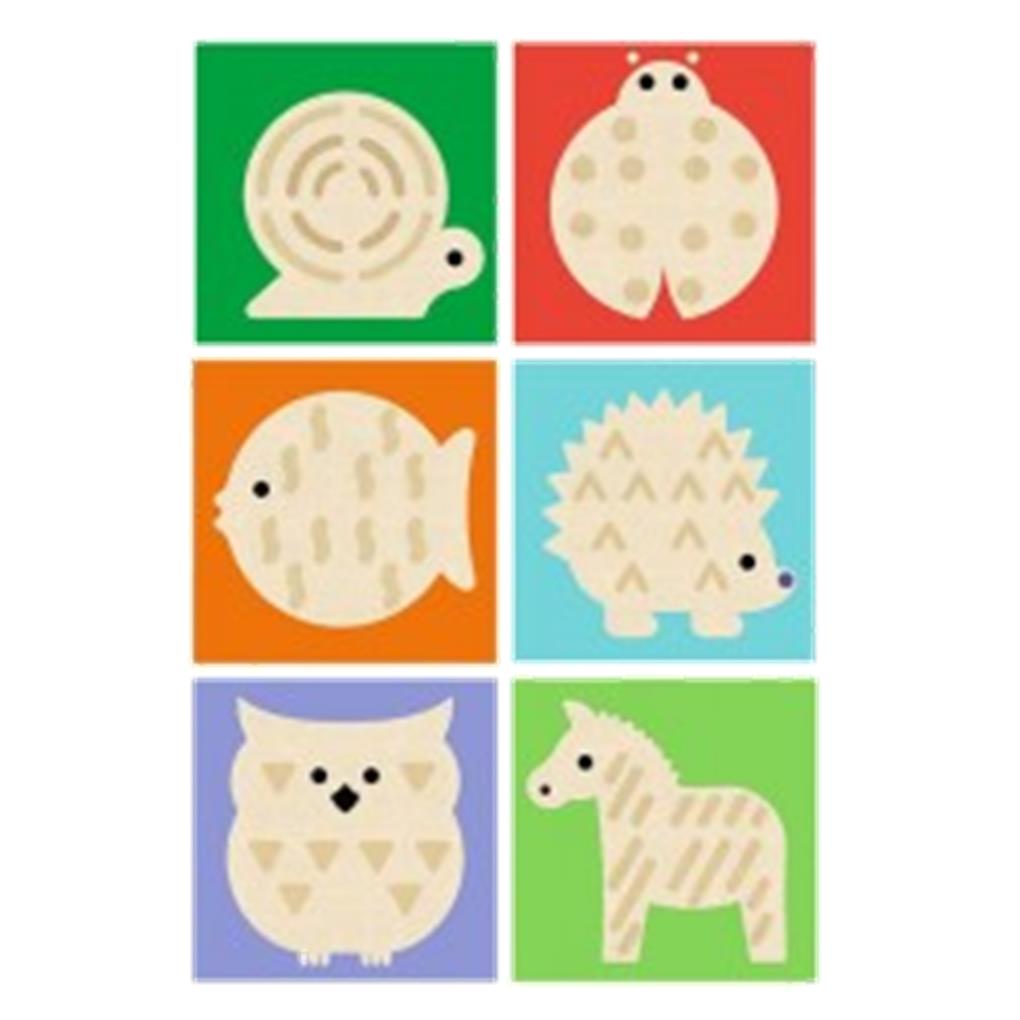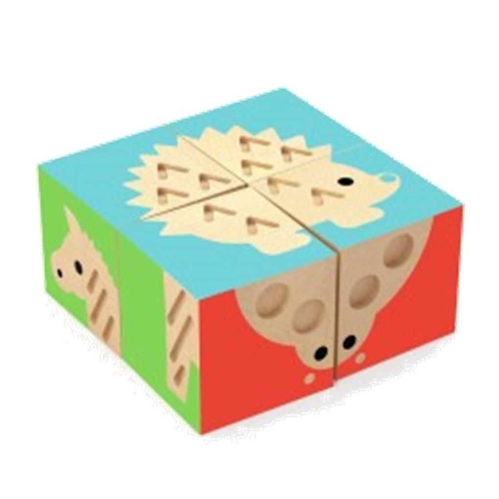 Cuatro cubos de madera ilustrados y grabados con diferentes motivos para que el niño asocie lo visual con el tacto. Al combinar colores y motivos, el niño reconstruye 6 animales.