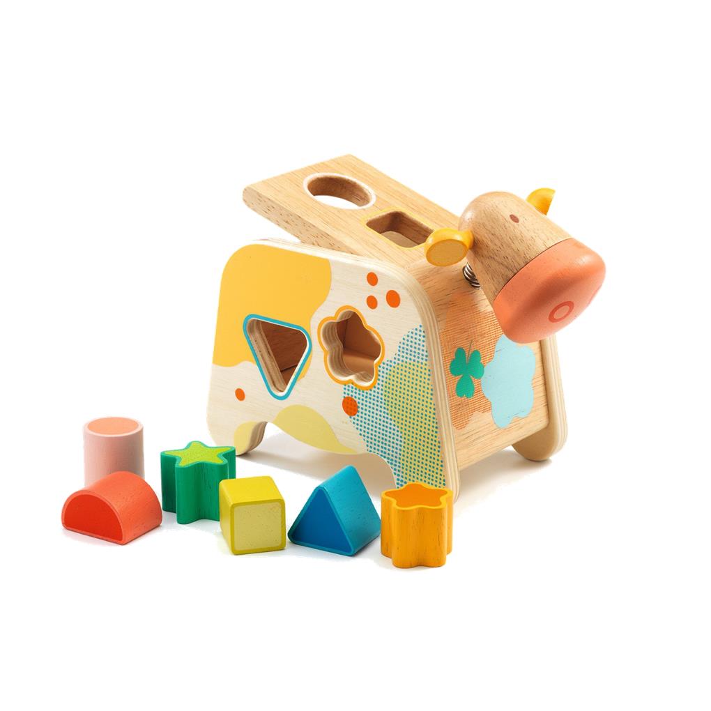-Una caja con forma de vaca de madera natural y colores suaves. Consta de 6 piezas de diferentes colores y formas que se introducen en la caja. El niño desliza las formas en los orificios correspondientes, guiado por la forma de la pieza, así como por su color. Una vez terminado, abre la tapa y recoge las piezas.