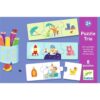 8 puzzles de tres piezas con dibujos de simpáticos personajes realizando acciones de la vida cotidia