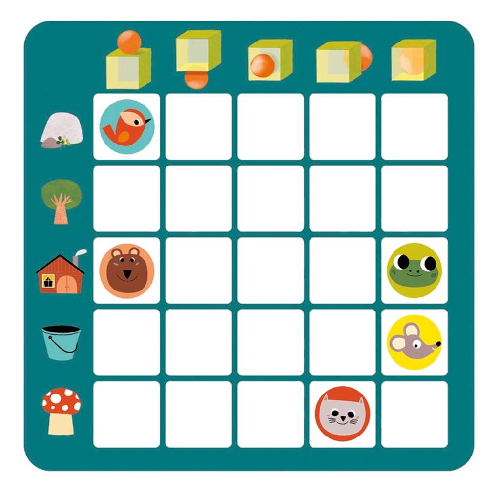 -Un juego de localización en el espacio en el que hay que encontrar la posición de los 5 animales en relación con los 5 elementos del decorado y colocar las fichas en el tablero. ¿Dónde está el ratón? ¡Está en el cubo! ¡Un juego sencillo y divertido! Para comprobar si las fichas están correctamente colocadas en el tablero, basta con consultar la solución indicada en el reverso de la carta.