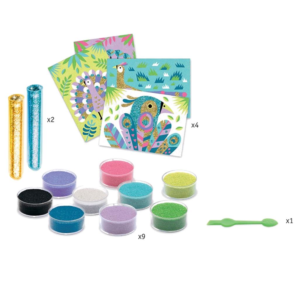 Contenido: 4 tarjetas parcialmente ilustradas con adhesivo (15 x 21 cm), 12 frascos de arena de colores, 1 herramienta de plástico, 1 folleto explicativo paso a paso a color.