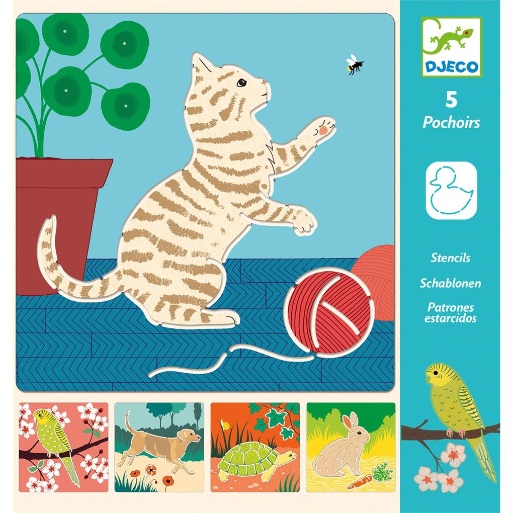 -5 plantillas profusamente ilustradas sobre el tema de los animales de compañía (tortuga, conejo, loro, perro y gato). Solo hay que seguir el dibujo de las hendiduras con el lápiz para trazar perfectamente estos enternecedores animales. ¡Son de plástico, lavables y muy resistentes para reutilizarlas sin parar!