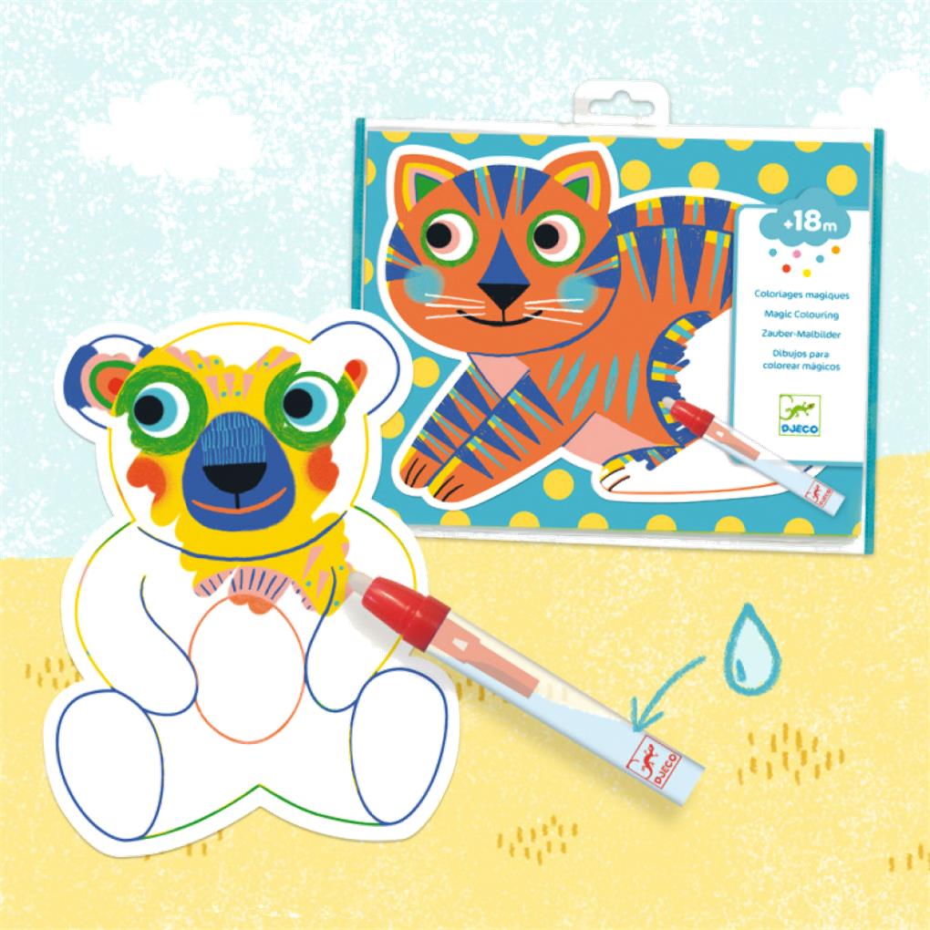 -Una carpeta de coloreado al agua adaptada para los niños, a partir de los 18 meses. El niño colorea los animales con el rotulador al agua para descubrir lo que se esconde. ¡Pura magia!: ¡los motivos aparecen y cambian de color! ¡Cuando las láminas se secan, el niño vuelve a empezar!