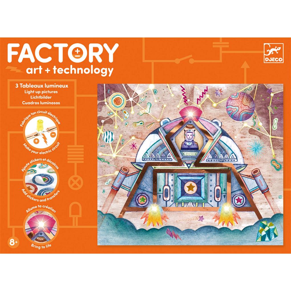 -Factory, una gama para aprender sobre la tecnología a través de pasatiempos creativos. Un cofre con el que el niño hace tres bonitos cuadros de transbordadores espaciales que se iluminan. Con el adhesivo conductor, el niño traza los circuitos eléctricos y luego incorpora la pila y los LED siguiendo los pasos descritos en el folleto. Después, personaliza sus creaciones con los numerosos accesorios incluidos. ¡Es mágico! Al hacer contacto, los cuadros se iluminan y se vuelven interactivos gracias al ingenioso sistema de interruptores. ¡Una vez dominada la técnica, el niño se lanza a la experimentación imaginando su circuito en el tablero adicional incluido en este kit!
