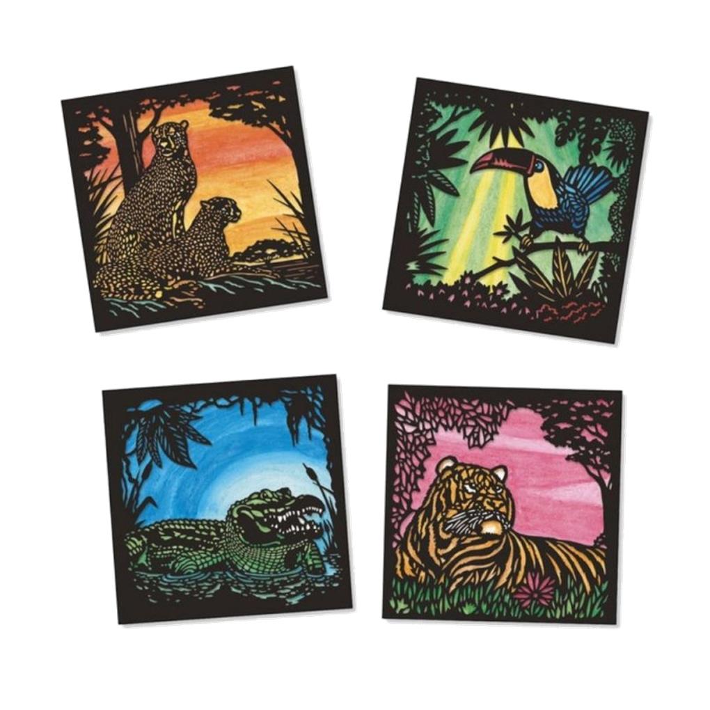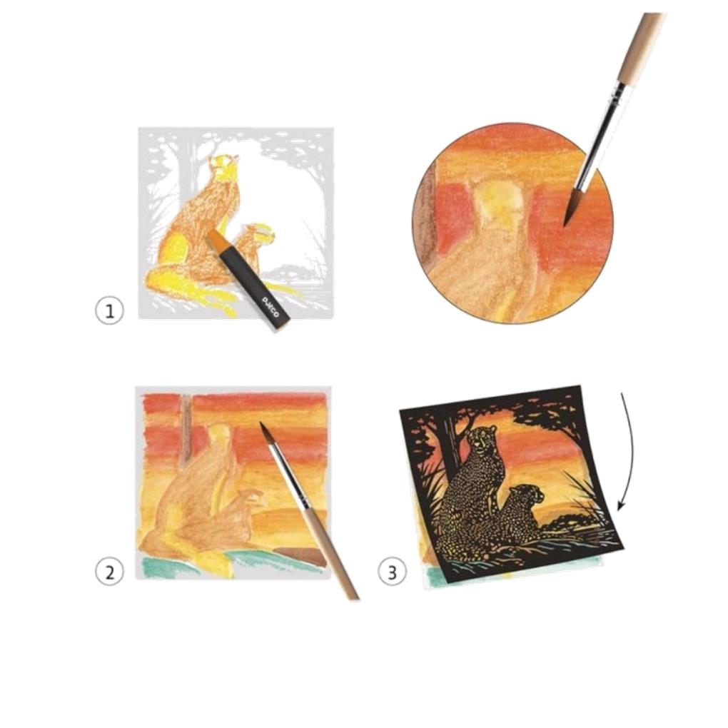 -Un taller de acuarelas sobre el tema de los animales salvajes especialmente desarrollado para que la actividad sea accesible a los más pequeños. Con facilidad, el niño aprende a hacer bonitos degradados con ceras para acuarela: aplican los colores en el interior de la tarjeta y luego los diluyen con su pincel mojado. Una vez terminada la actividad, cierra la tarjeta: los adornos de encaje de papel destacan frente al cielo como a contraluz.