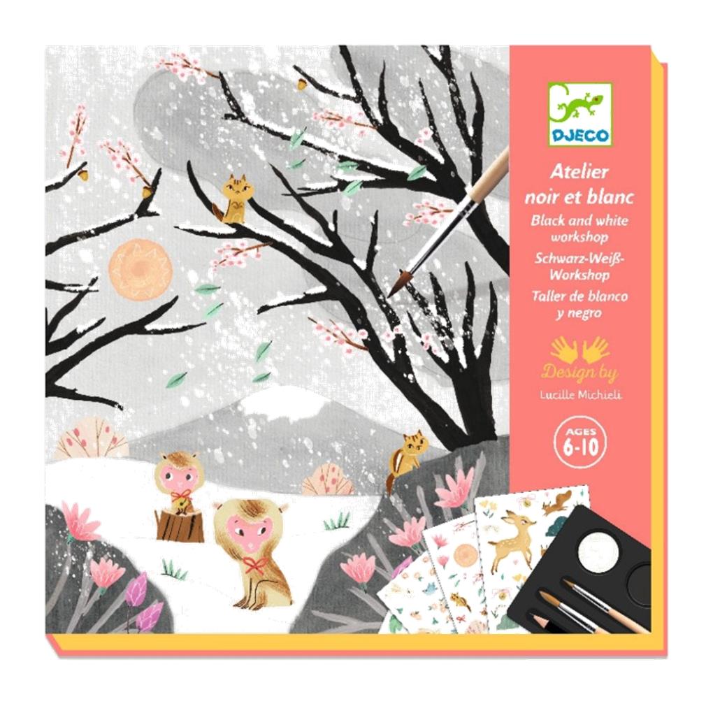 -Una actividad de pintura y collage inspirada en estampas japonesas que incluye 4 cuadros para decorar y aprender la técnica de la aguada con facilidad. Entre el blanco y el negro, el niño juega equipado con sus pinceles con una gama de colores para crear paisajes que luego completa con las calcomanías.