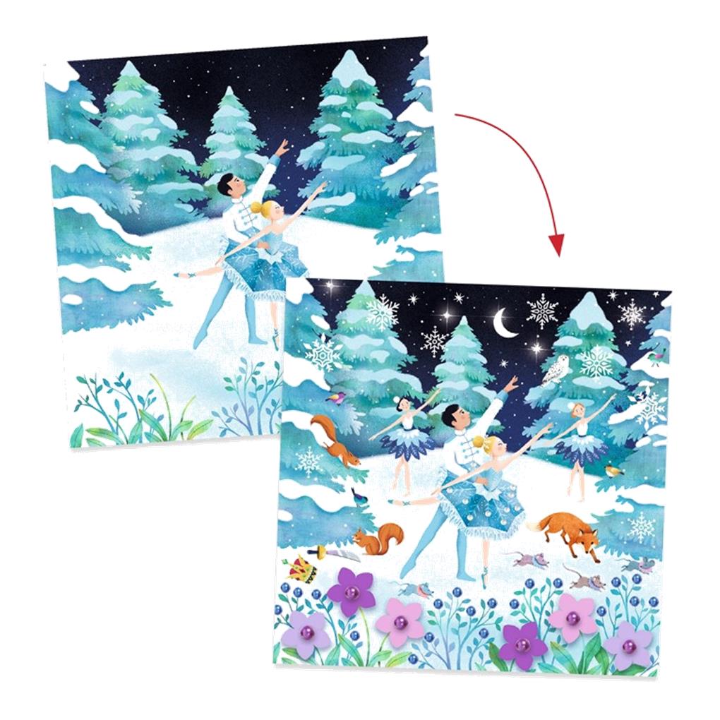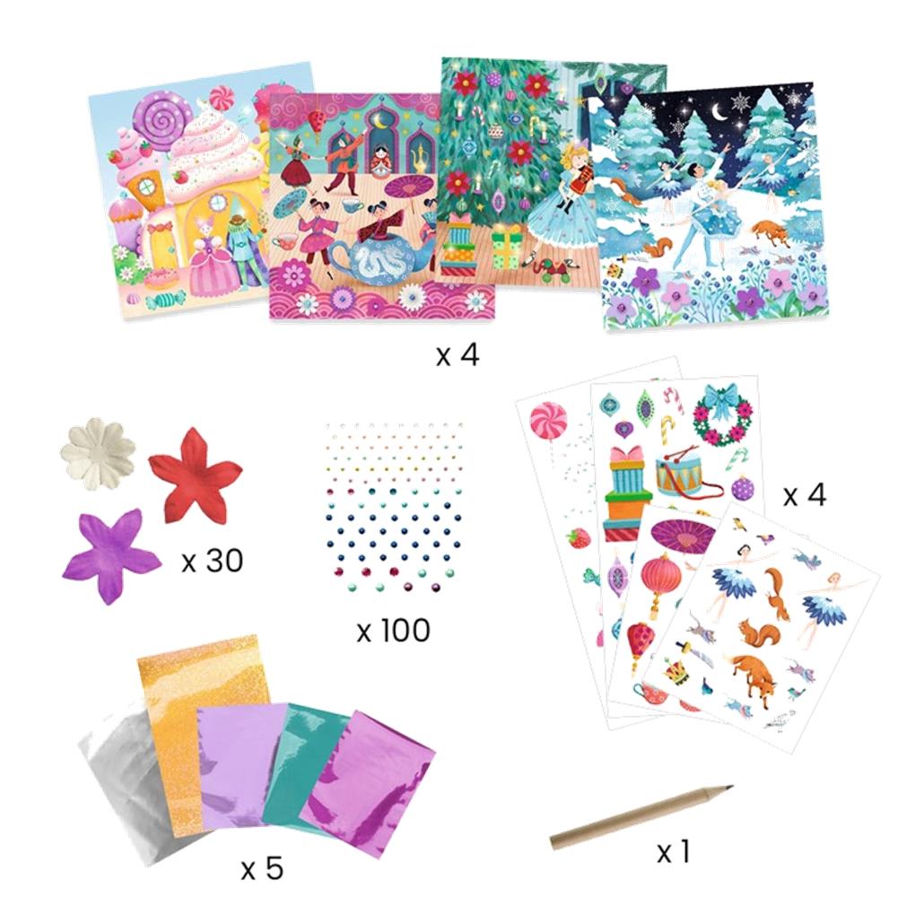 El set contiene: 4 imágenes, calcamonías. flores de papel, 100 diamantes de imitación autoadhesivos y papeles metalizados.