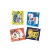 Este kit propone decorar 4 tarjetas ilustradas con microesferas de colores. El niño descubre las áreas adhesivas con la herramienta de plástico y luego aplica las microesferas para completar las ilustraciones. Práctico: gracias al marco grueso, las bolas no se dispersan por todas partes.