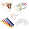 Contenido: 5 siluetas transparentes de plástico mágico para colorear, 5 cables metálicos con cierres de rosca, 5 anillas de unión, 5 láminas modelo, 6 lápices de colores mini, 1 cuadernillo de explicaciones paso a paso en color.