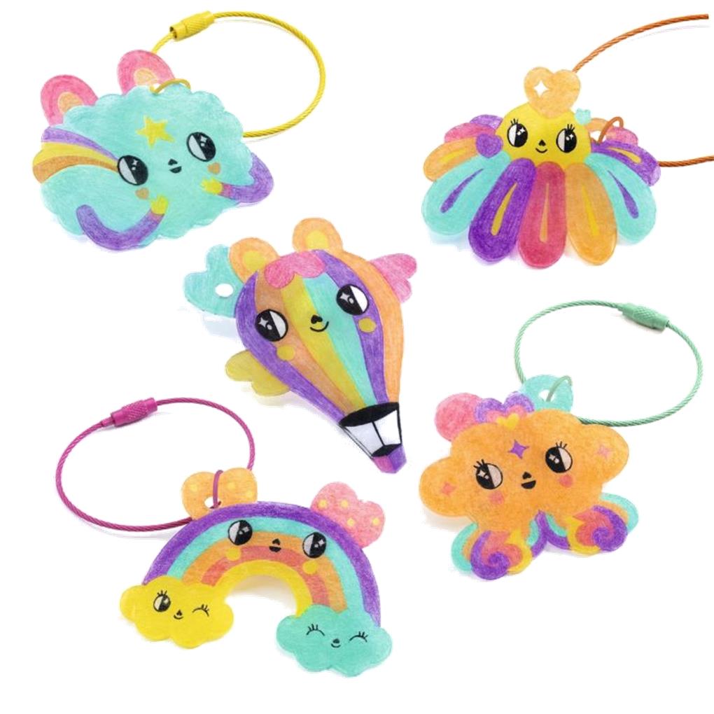 -¡Este kit invita al niño a crear cinco llaveros que representan personajes kawaii con plástico retráctil! Para ello, coloca el modelo bajo la correspondiente silueta de plástico transparente y reproduce el modelo