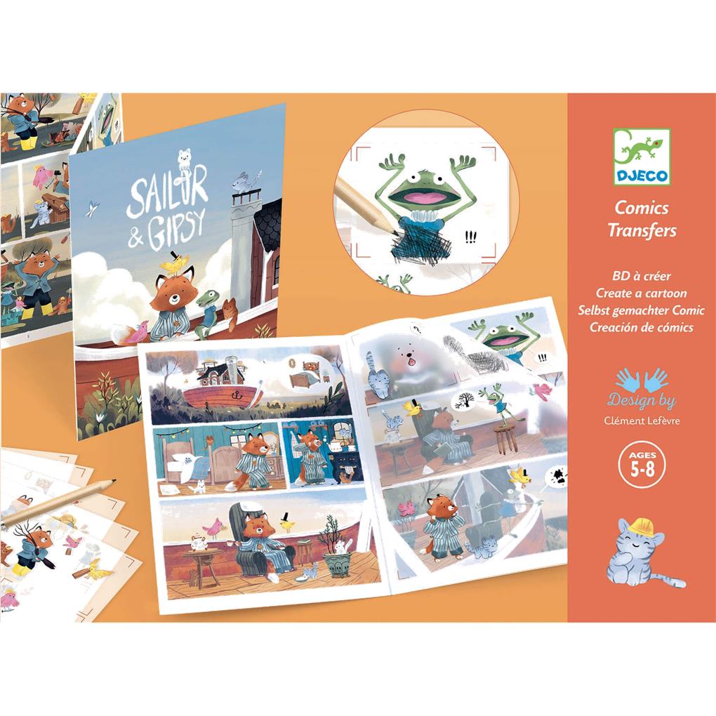 -Este estuche permite al niño crear un cómic con personajes divertidos y entrañables utilizando calcomanías: las imágenes se frotan con un lápiz para transferirse al decorado. Paso a paso, el niño coloca los elementos en las láminas ilustradas para completar la historia que va tomando forma ante sus ojos.