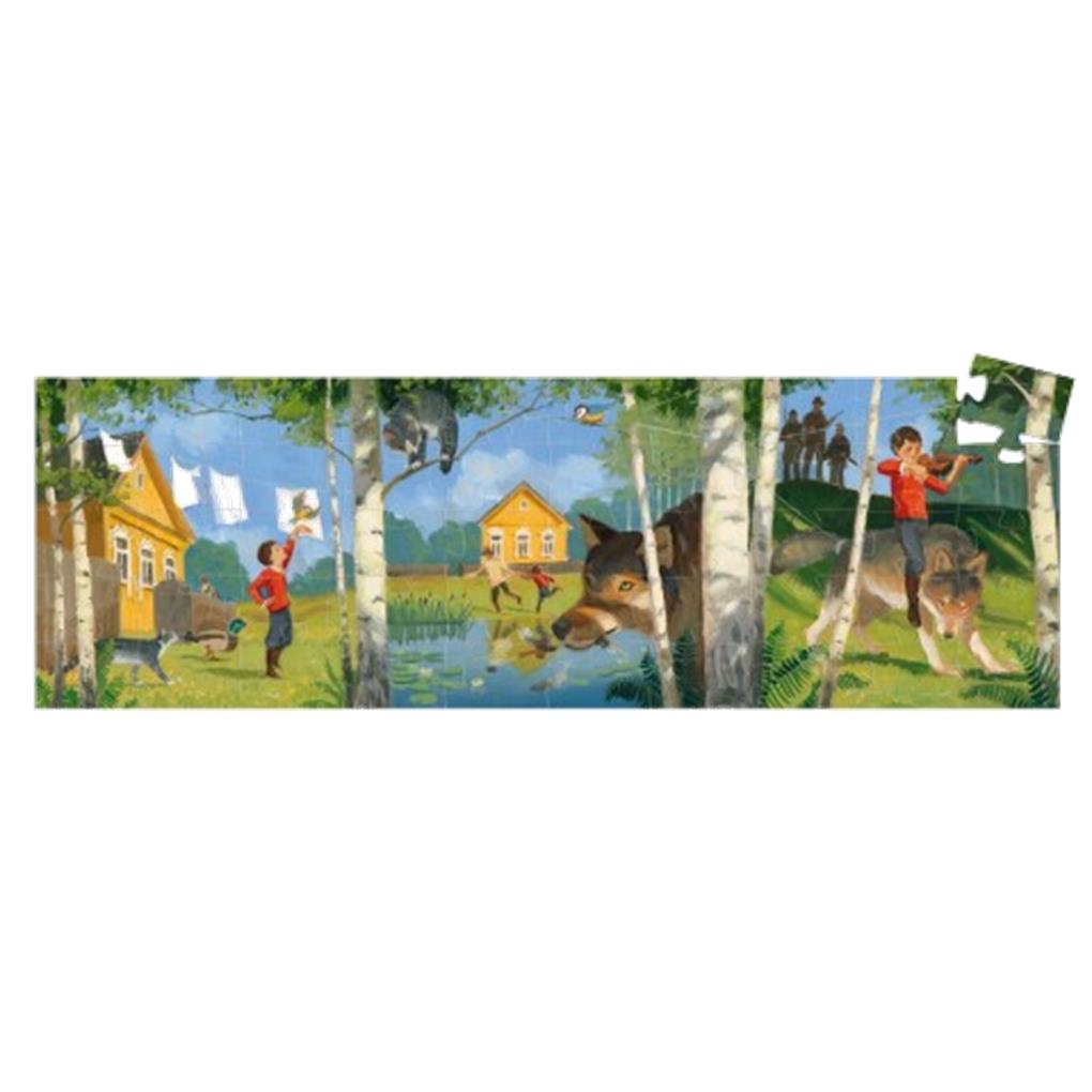 -El niño arma un puzle con forma de cenefa para descubrir el famoso cuento de Pedro y el lobo. Este magnífico puzle de 50 piezas se presenta en una bonita caja con silueta.