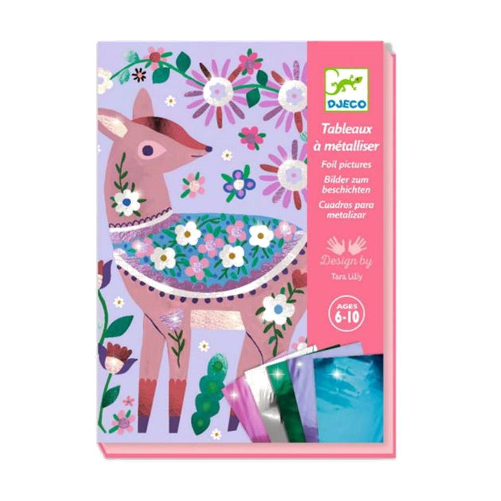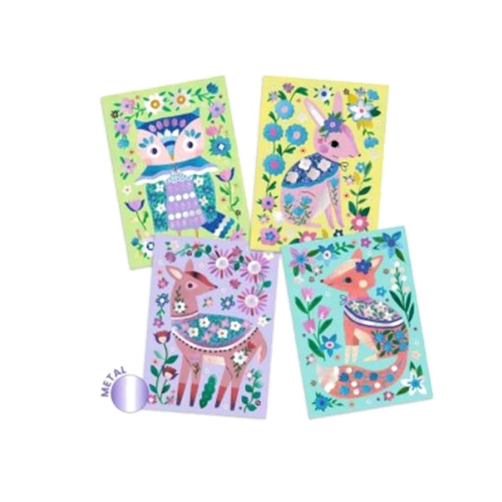 Contenido: 4 tarjetas ilustradas y con adhesivo (15 x 21 cm), 15 hojas de metal para colocar, 1 herramienta de plástico para descubrir las superficies adhesivas, 1 folleto explicativo paso a paso a color.