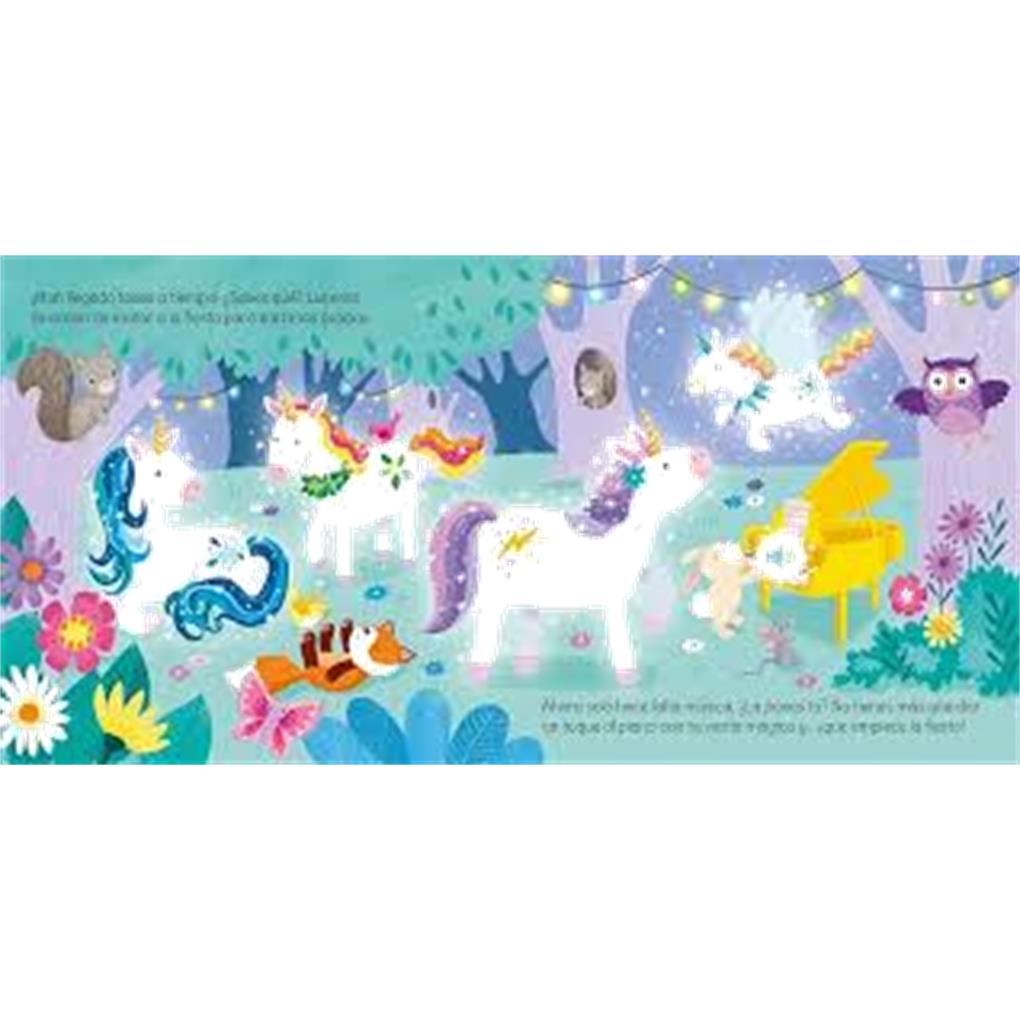 Un divertido libro sonoro con varita mágica incluida. Al colocarla sobre la zona marcada en cada página y pronunciar las palabras mágicas, los niños podrán escuchar cómo cobran vida los unicornios, lanzar hechizos e invitarlos a todos a la fiesta final.