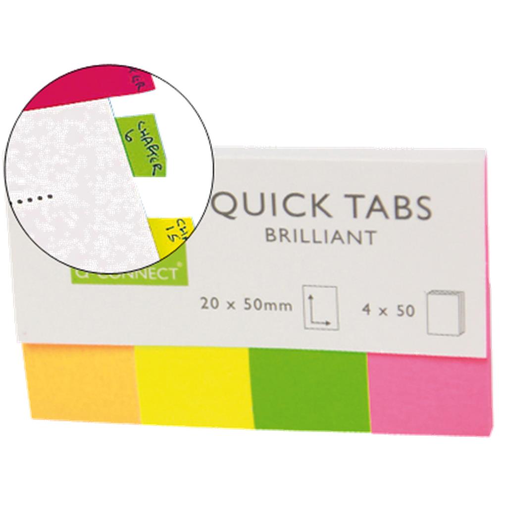 Banderitas separadoras q-connect 20×50 mm fluorescente pack de 4 con 50 hojas.