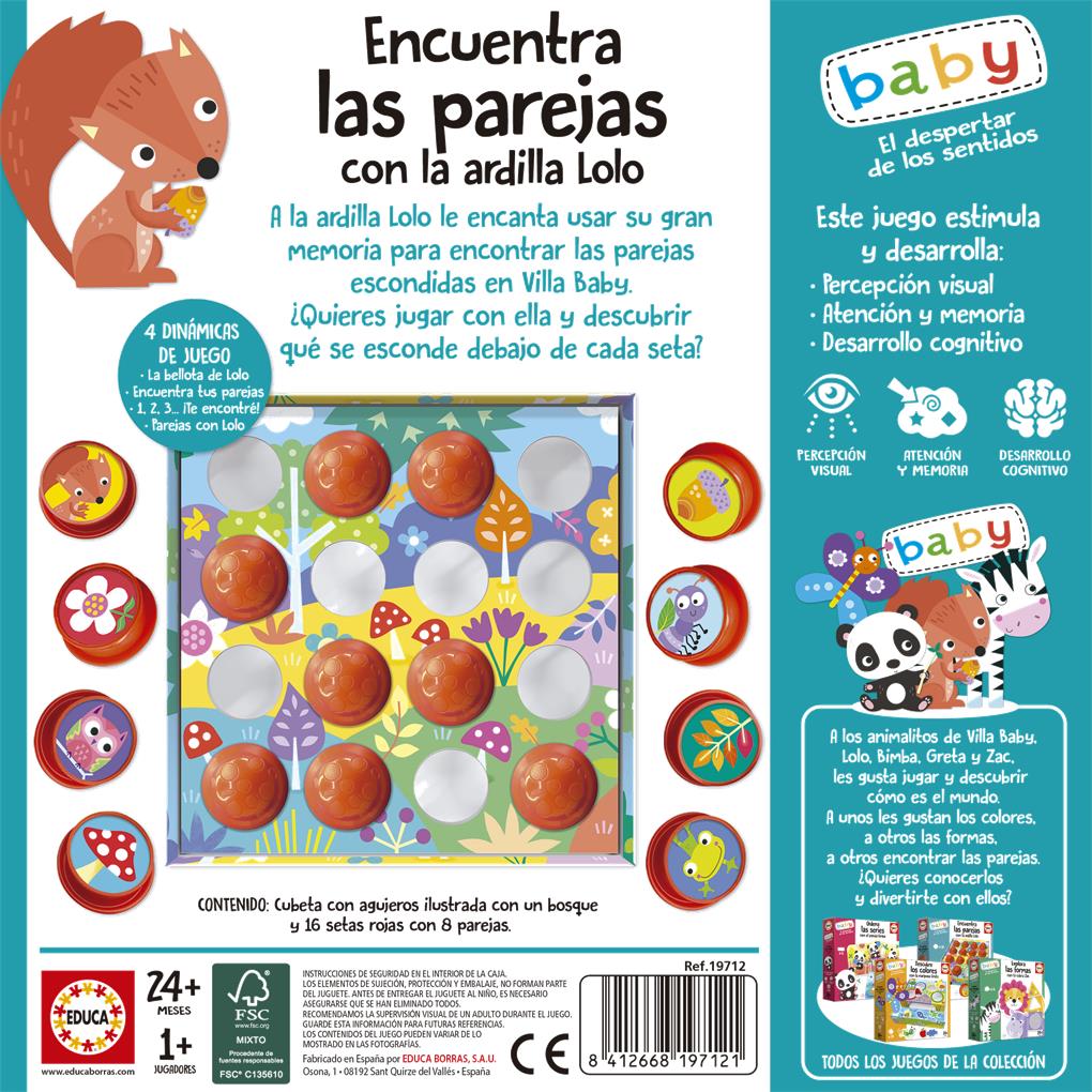 Juego de memoria y de experimentación. Las 16 piezas deben colocarse boca abajo sobre la mesa. El niño escoge una ficha, le da la vuelta para ver la imagen que esconde e intenta encontrar la misma imagen levantando otra ficha para así formar una pareja. CONTENIDO: – 16 piezas de plástico que permiten formar 8 parejas. Acompaña a la ardilla Lolo a encontrar las parejas.