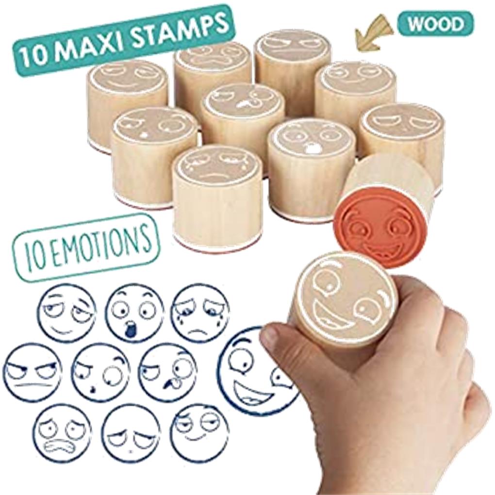 Set con 10 maxi-sellos para jugar y representar las 10 emociones básicas que guían nuestro comportamiento: alegría, seguridad, admiración, curiosidad, sorpresa, ira, asco, tristeza, miedo y culpa. El niño puede identificar y expresar sus emociones. Ayuda a desarrollar habilidades sociales y emocionales. Aptos para cualquier tinta.