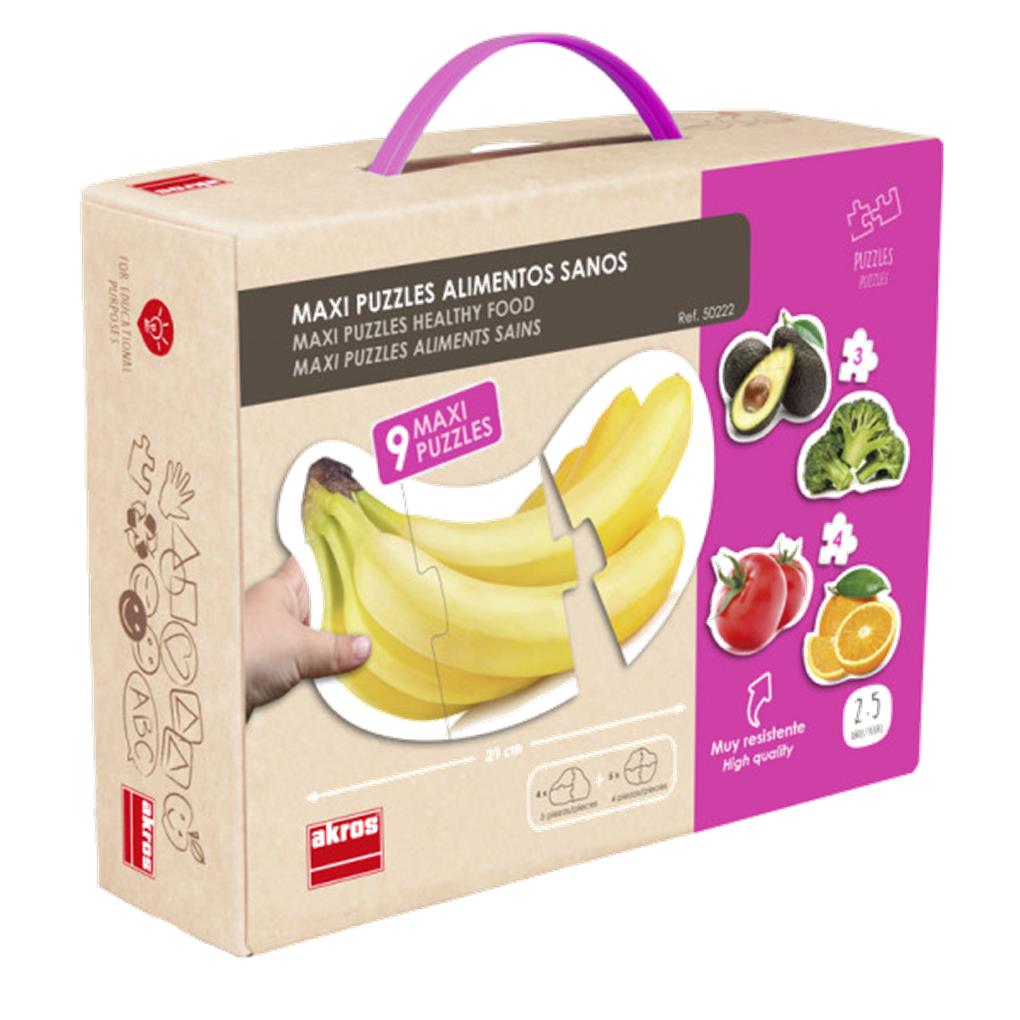 Set de 9 puzzles silueteados con alimentos de gran tamaño, de 3 y 4 piezas, para niños a partir de 2 años. Realizados con piezas grandes en cartón grueso de máxima calidad y resistencia.