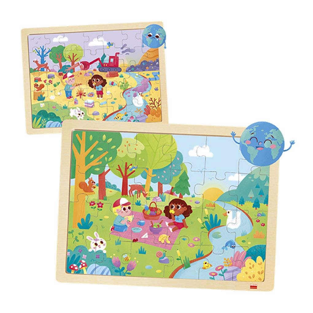 Ayudan a sensibilizar sobre el impacto medioambiental que tienen nuestros actos y decisiones. Incluye 4 eco-puzles de madera sostenible de 24 y 35 piezas.