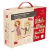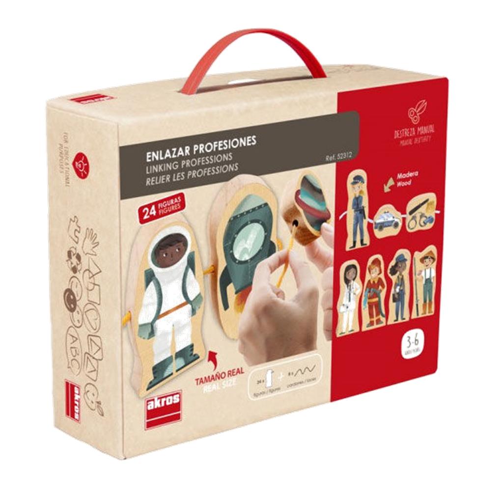 Set de 24 figuras de madera para enlazarlas entre sí, representando diferentes oficios y sus elementos relacionados. Permite al niño enlazar cada oficio con sus elementos y jugar con las figuras, que además se mantienen de pie. Incluye 8 cordones de colores. Desarrolla la psicomotricidad fina en niños a partir de 2 años. Inspirado en la metodología Montessori.