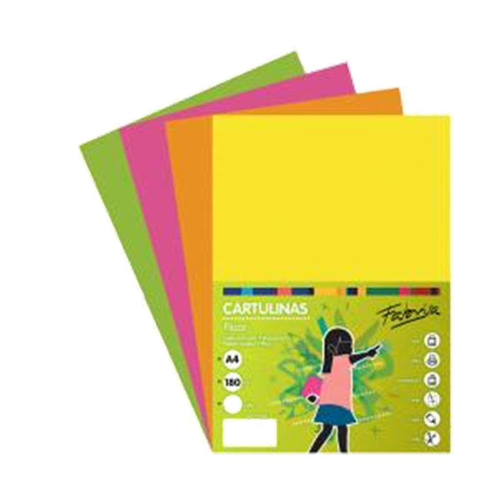 Cartulina surtido fluor de 180 g/m² tamaño A4. Cada pack contiene 50 cartulinas de 4 colores: verde fluor, naranja fluor, rosa fluor y amarillo fluor. Cartulinas tintadas en masa, ofreciendo así unos colores más homogéneos y nítidos. Ideal para su uso escolar, todo tipo de manualidades, cubiertas, separadores, impresión de documento, etc.