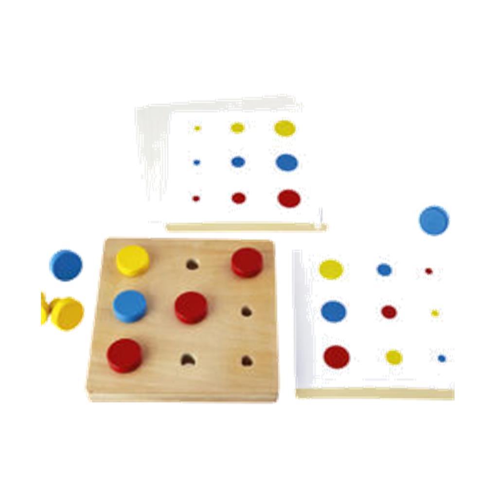 El niño dispone de 9 tornillos de 3 colores y 3 diámetros diferentes