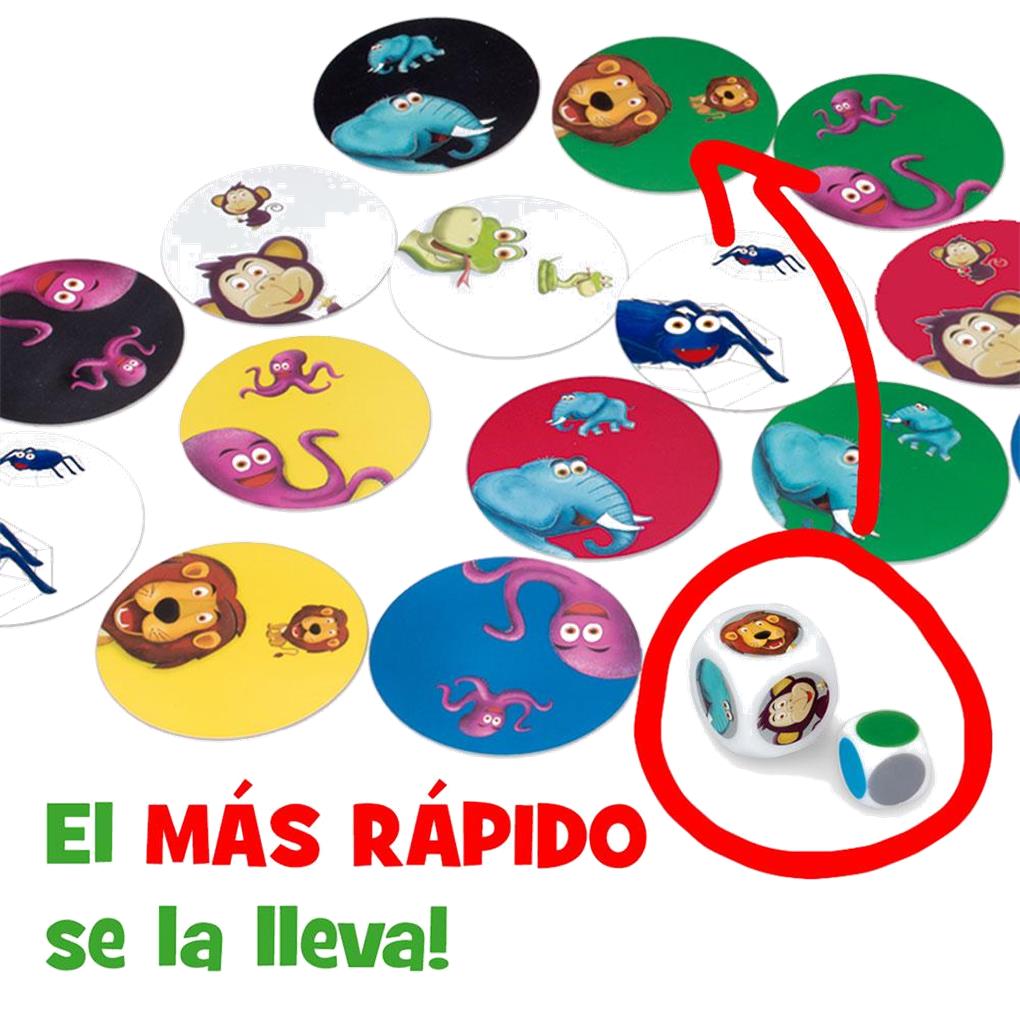 2. Se tiran ambos dados; resultando una combinación de color y animal, todos los jugadores tratan de ser el primero que ponga su mano encima de la carta correcta para ganarla.