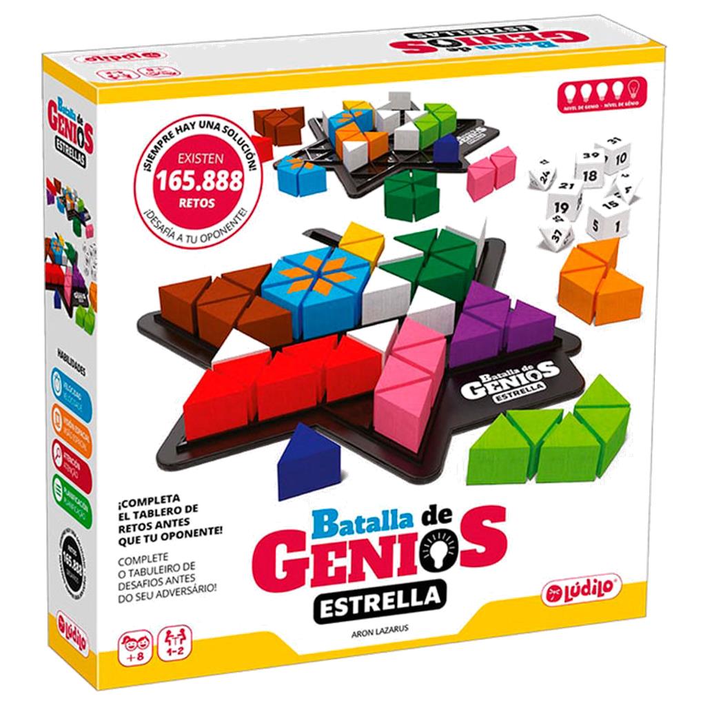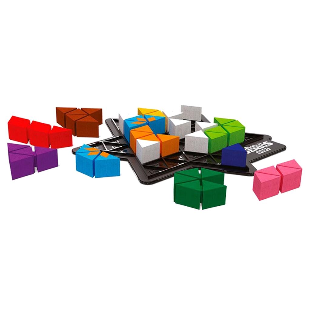 Completa la estrella con las once piezas de colores, una vez que se hayan colocado los siete bloqueadores en las posiciones que indican los dados. Puede que a veces parezca imposible, pero SIEMPRE habrá al menos una solución…