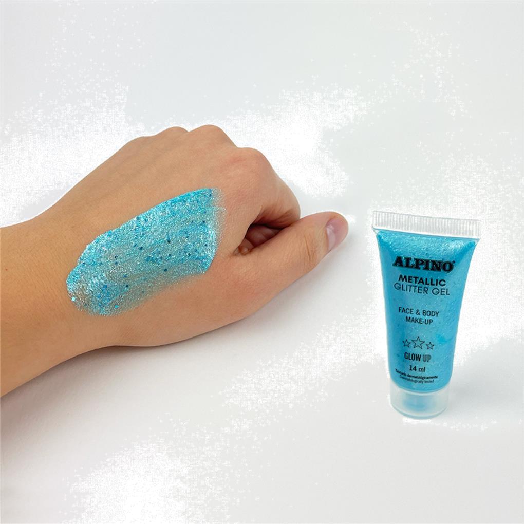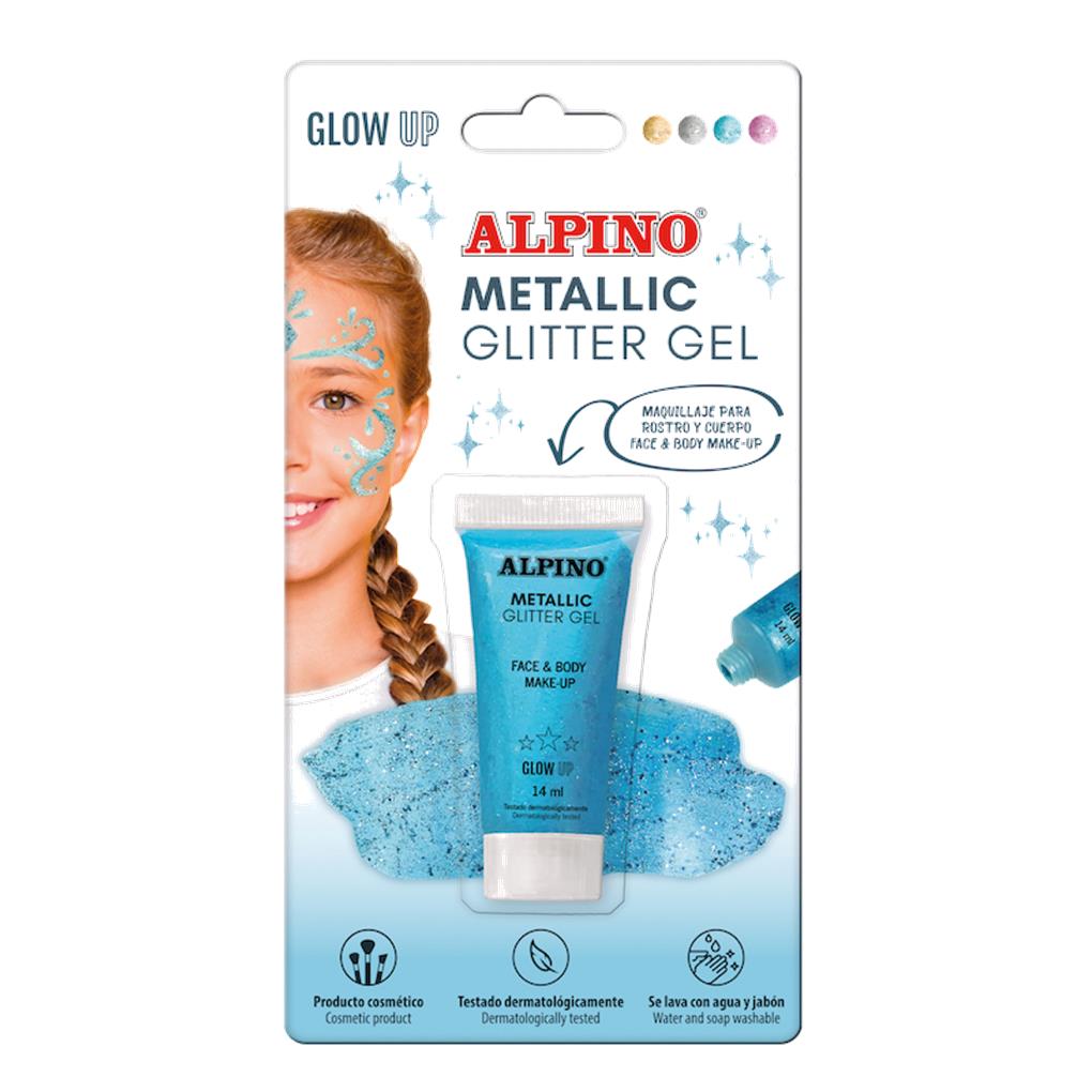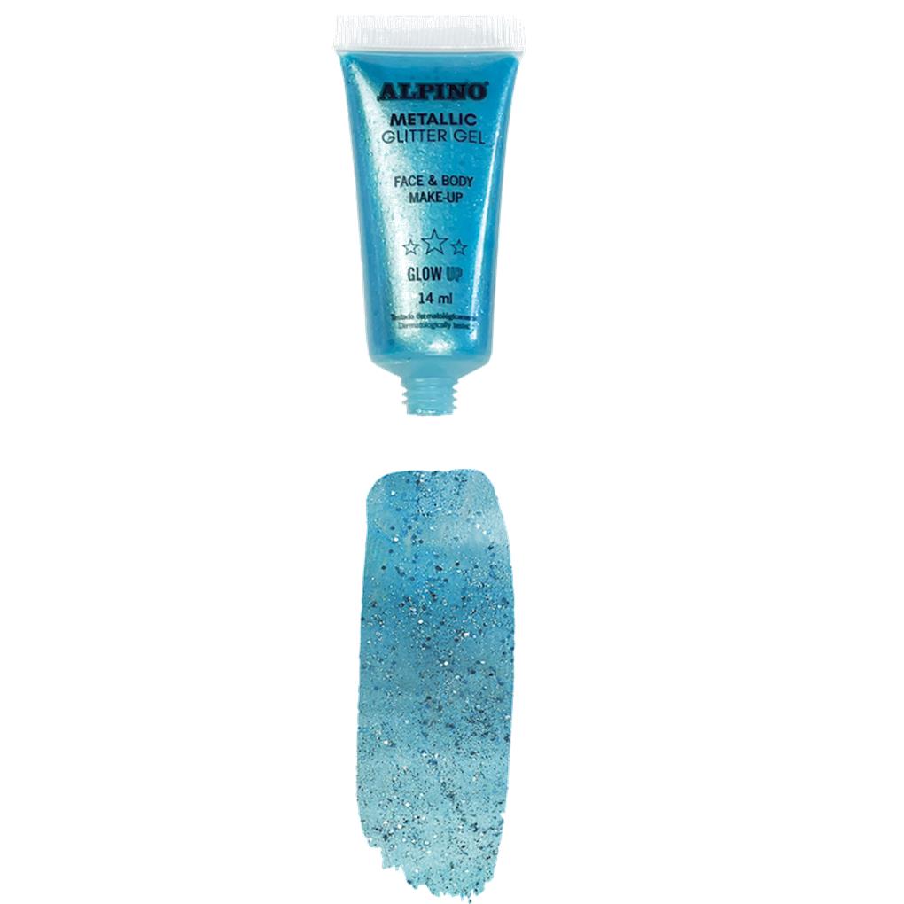 Metallic Glitter Gel Alpino Fiesta color azul . El Gel purpurina metalizado con base de color azul es un maquillaje líquido facial para fiestas, Carnaval, Halloween apto para niños y adultos