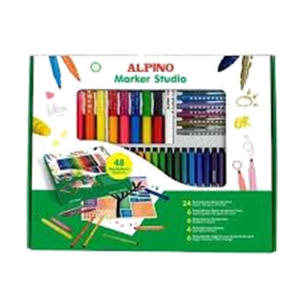 Set completo de Rotuladores para divertirse y desarrollar la creatividad. Contiene: 24 rotuladores Alpino, 6 rotuladores tonos pastel, 6 rotuladores metalizados para pintar sobre superficies oscuras, 6 rotuladores stampers y 6 rotuladores mágicos que cambian de color.