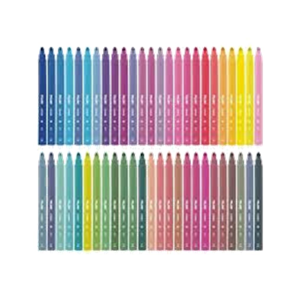 Rotuladores de punta cónica 5 mm Ø que permite realizar trazos desde 0,75 mm a 3 mm. Punta resistente a los golpes y a la presión. Tinta a basede agua que proporciona unos colores brillantes de fácil aplicación y mezclables entre sí. Por su tipo de punta se recomiendan para rellenar superficies de color. Puede lavarse fácilmente sobre la mayoría de tejidos(poner la prenda en remojo en agua fría durante una hora y lavar a máquina, también con agua fría). Con capuchón de seguridad ventilado. 50 colores. Maletín rígido con diseño infantil.