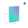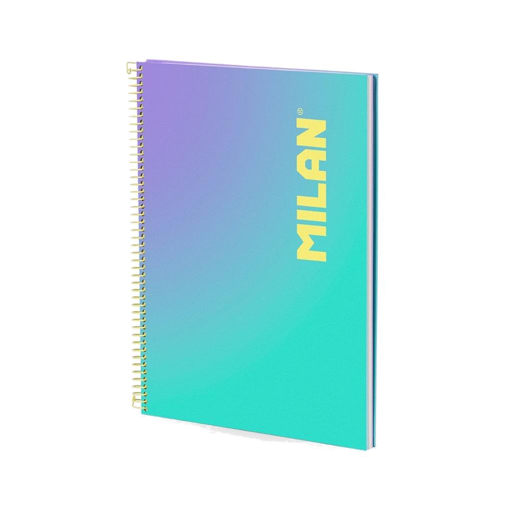 Cuaderno A4 con espiral metálica y tapa dura. 90 hojas de papel cuadriculado (5 x 5 mm) con 3 bandas de colores (30 hojas por color). Papel de 95 gr/m² de alta calidad, microperforado y con 4 taladros. Iniciador de corte para facilitar la separación de cada hoja. Cubierta de cartón rígido y logotipo MILAN brillante en relieve. Espiral flexible con cierre de seguridad que evita enganches con la ropa o rayaduras en muebles. Color turquesa. Colección Sunset: una combinación de colores degradados inspirados en el atardecer mediterráneo, acompañados de detalles en blanco y negro. Medida A4: 29,5 x 24 x 2 cm.