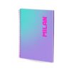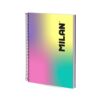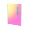 Cuaderno A4 con espiral metálica y tapa dura. 90 hojas de papel cuadriculado (5 x 5 mm) con 3 bandas de colores (30 hojas por color). Papel de 95 gr/m² de alta calidad, microperforado y con 4 taladros. Iniciador de corte para facilitar la separación de cada hoja. Cubierta de cartón rígido y logotipo MILAN brillante en relieve. Espiral flexible con cierre de seguridad que evita enganches con la ropa o rayaduras en muebles. Color rosa. Colección Sunset: una combinación de colores degradados inspirados en el atardecer mediterráneo, acompañados de detalles en blanco y negro. Medida A4: 29,5 x 24 x 2 cm.